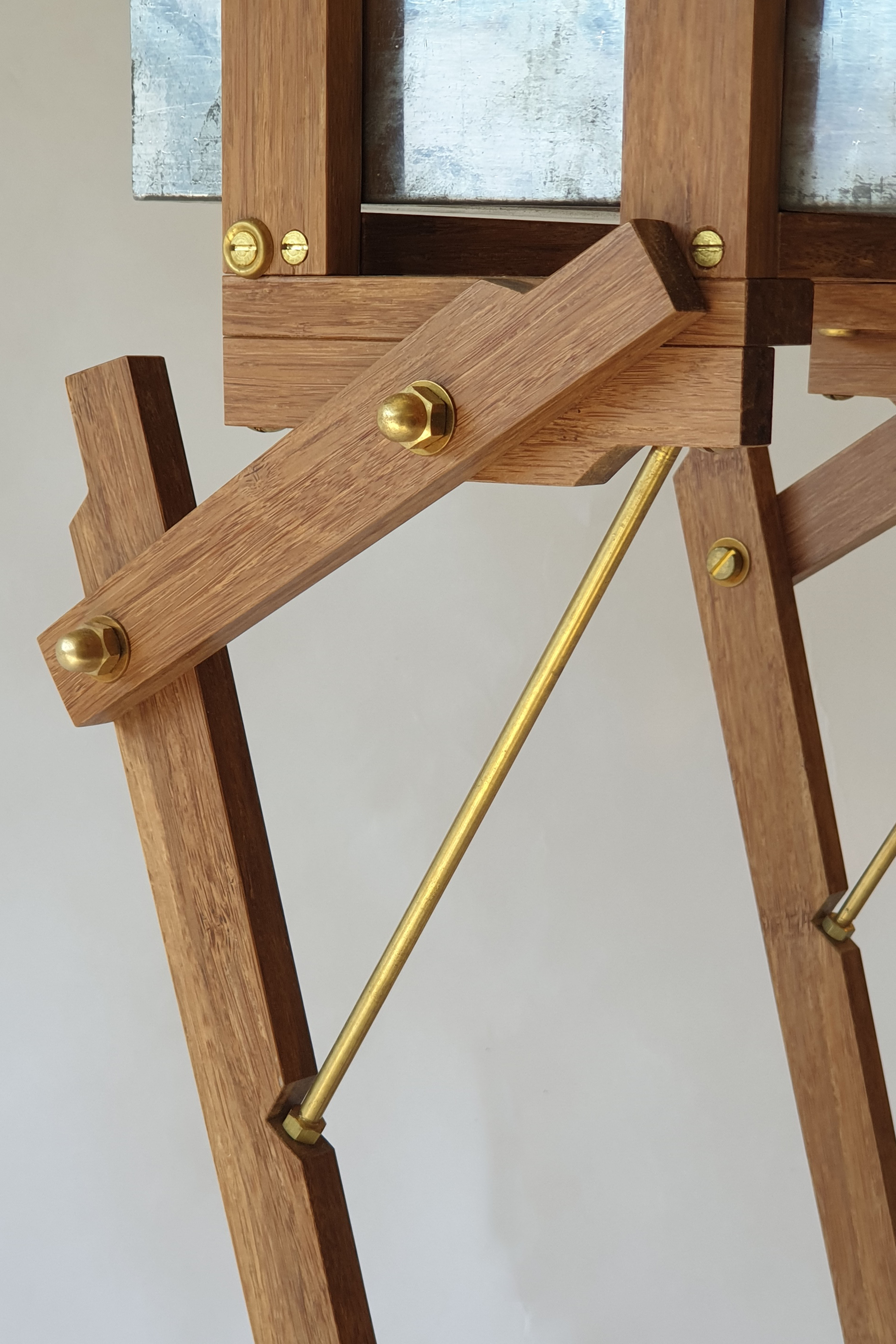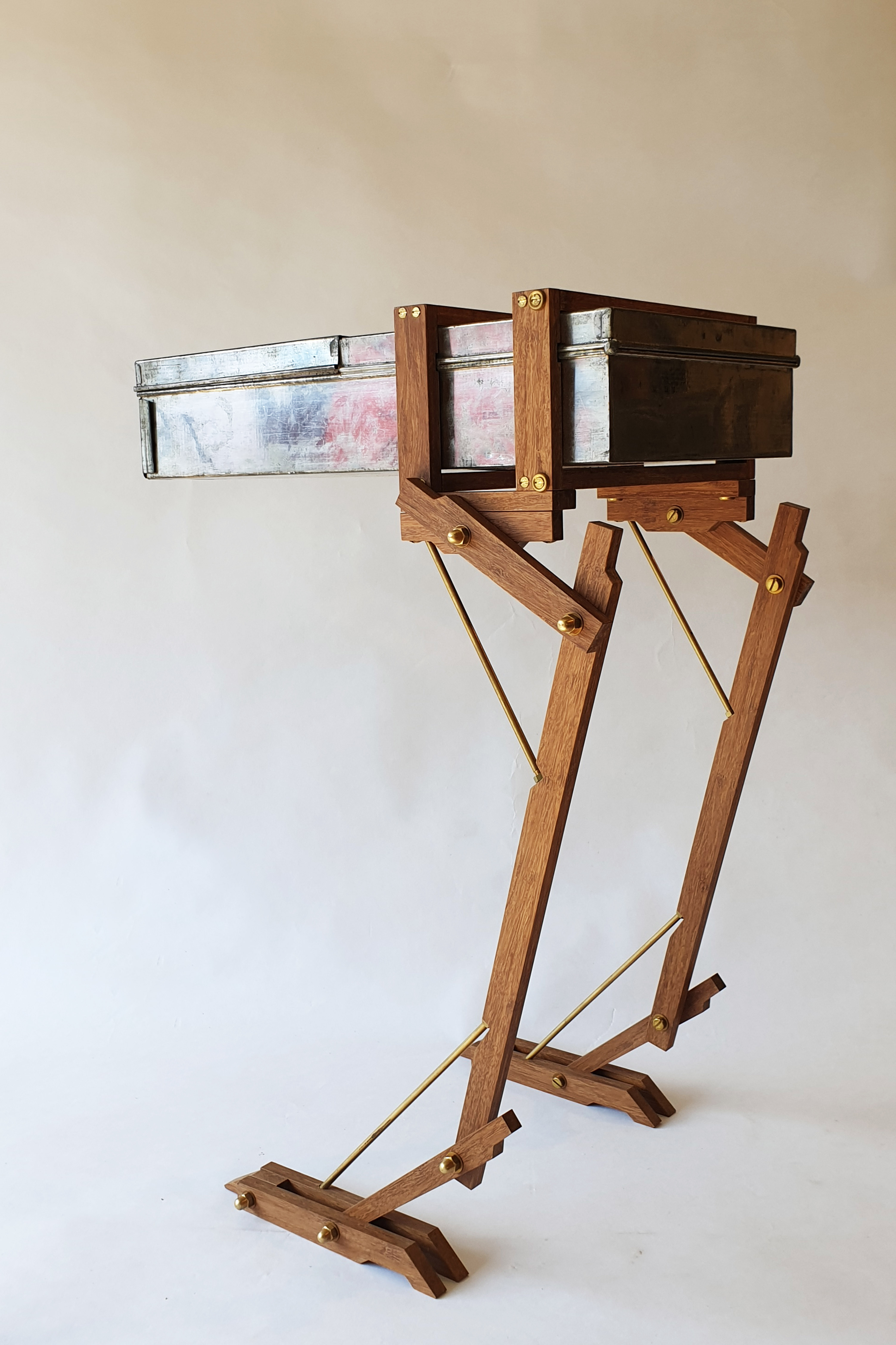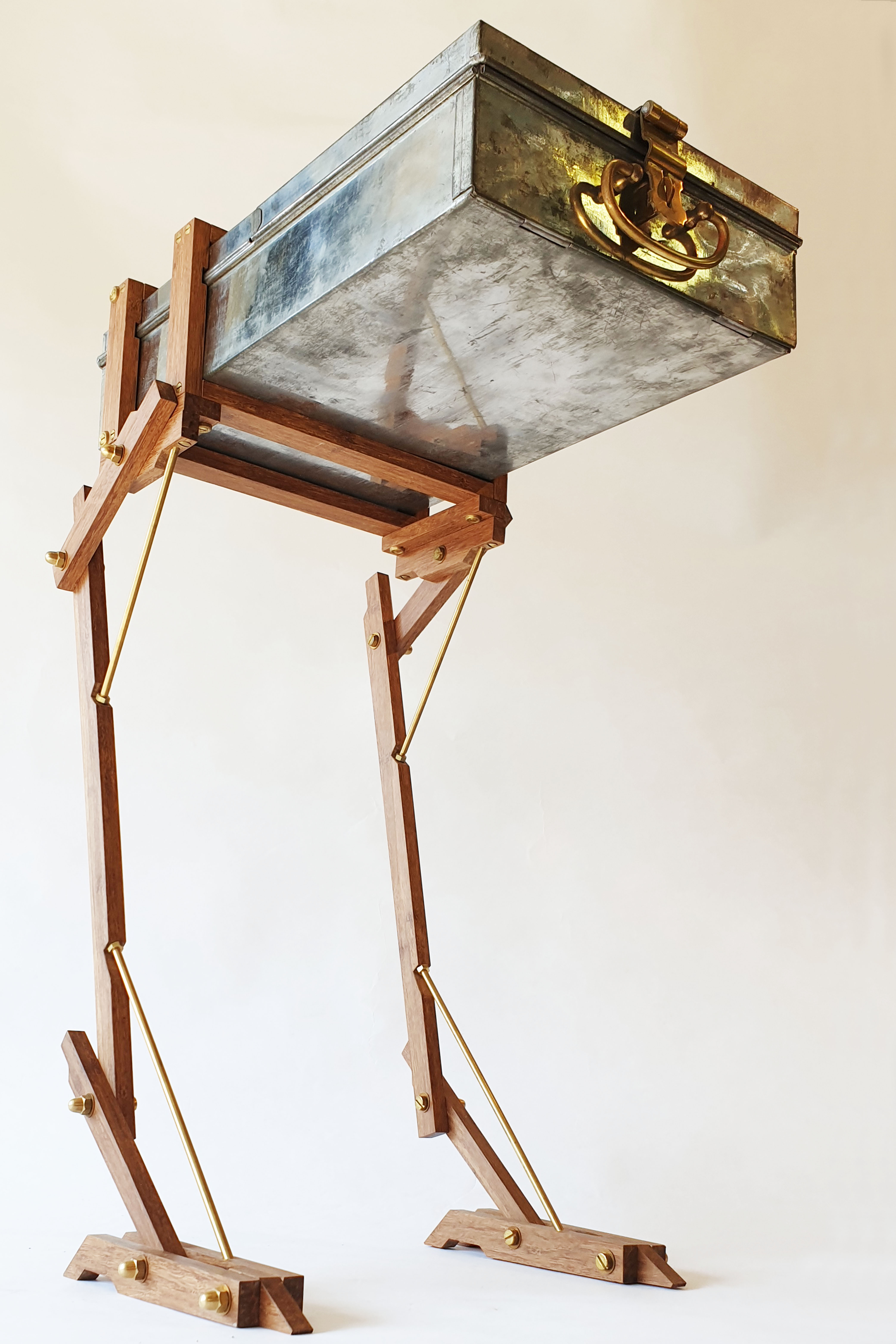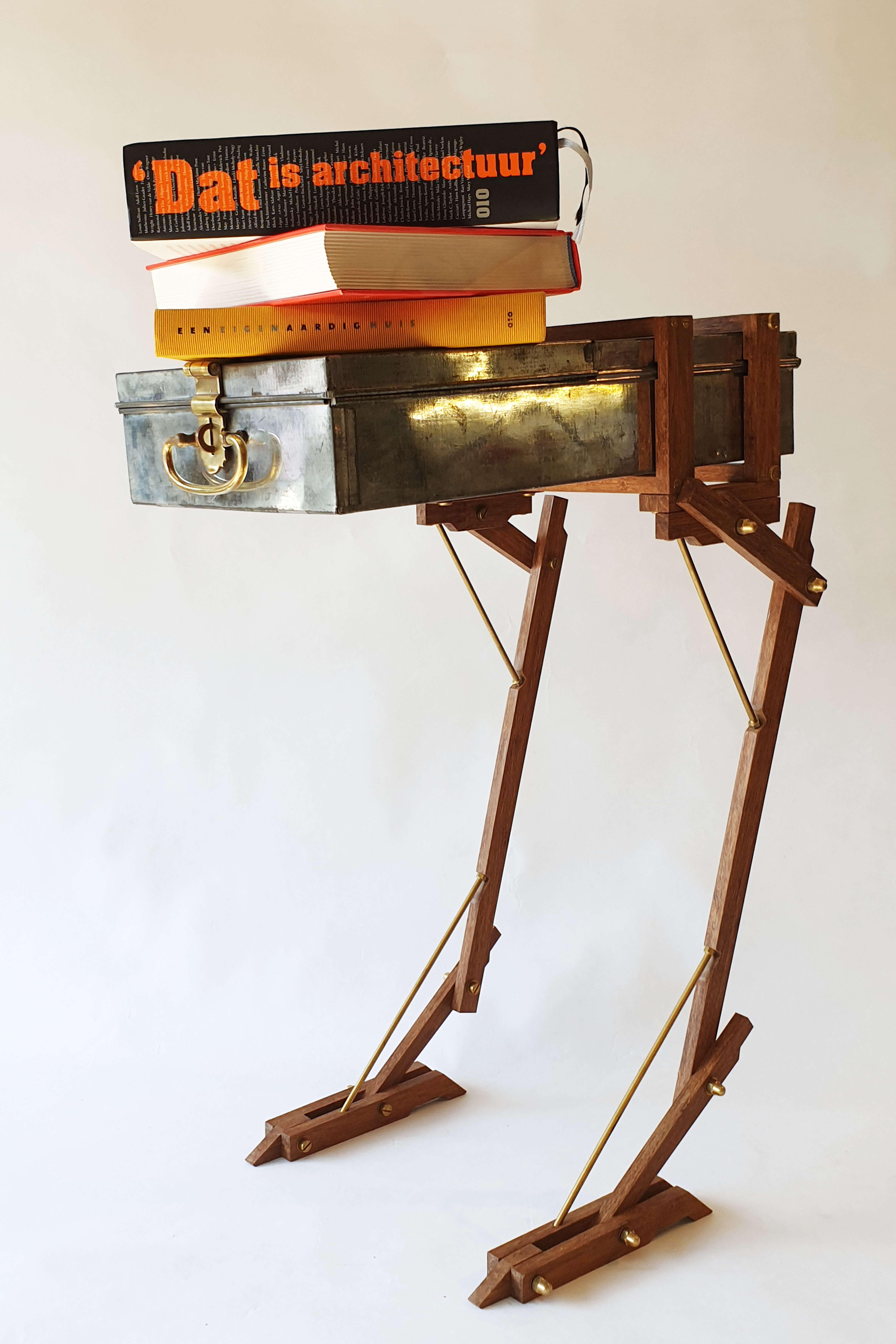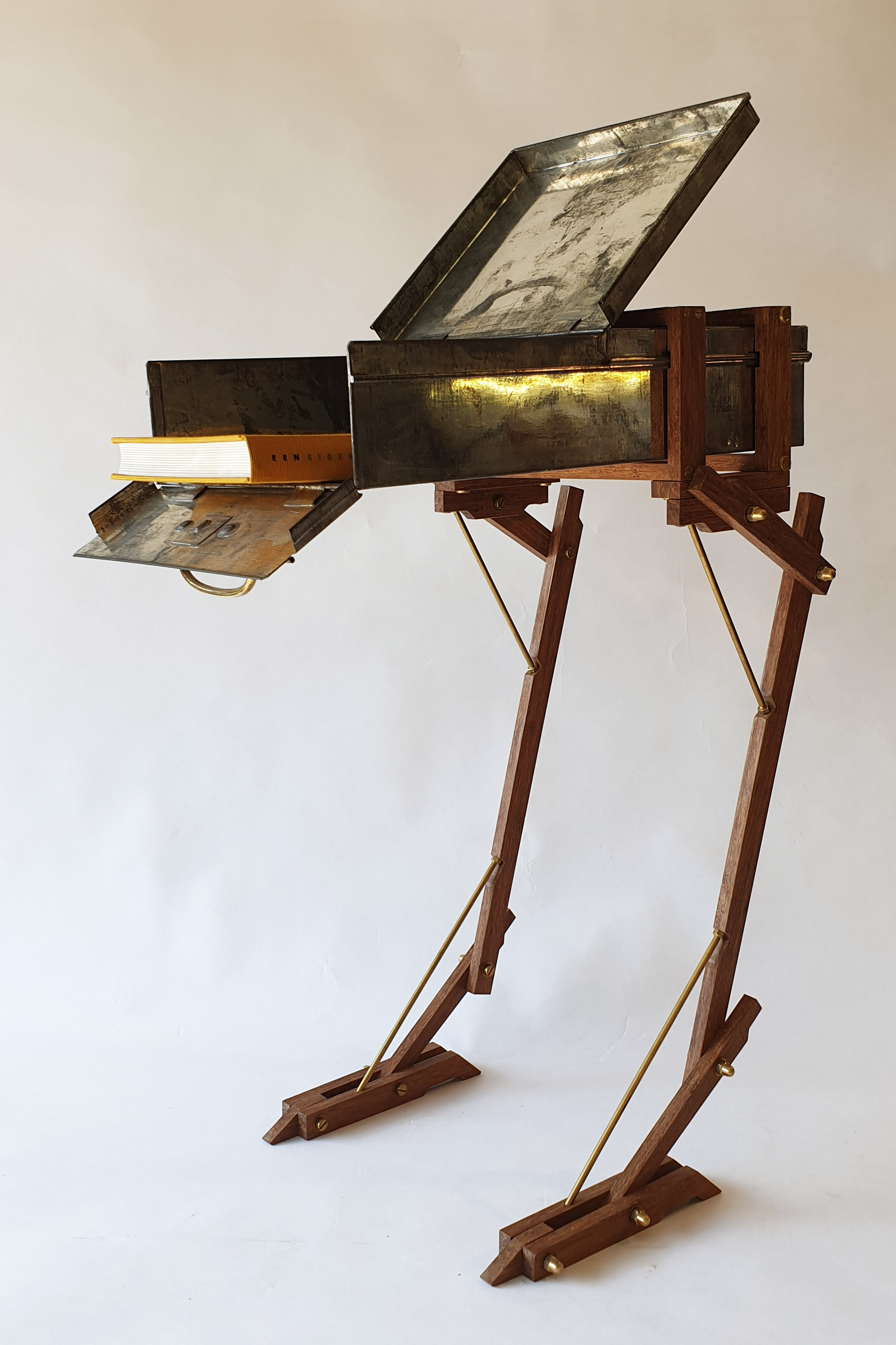 Cabinet made from a modified safe box, used by ABN Amro Bank from 1950 till 2000. The wings are made of a old brass boat propellor. The legs are made of bamboo and brass. Dimension safe box: L: 43cm W: 16cm H: 9cm. Total height, including legs: 64cm. Made in 2020
