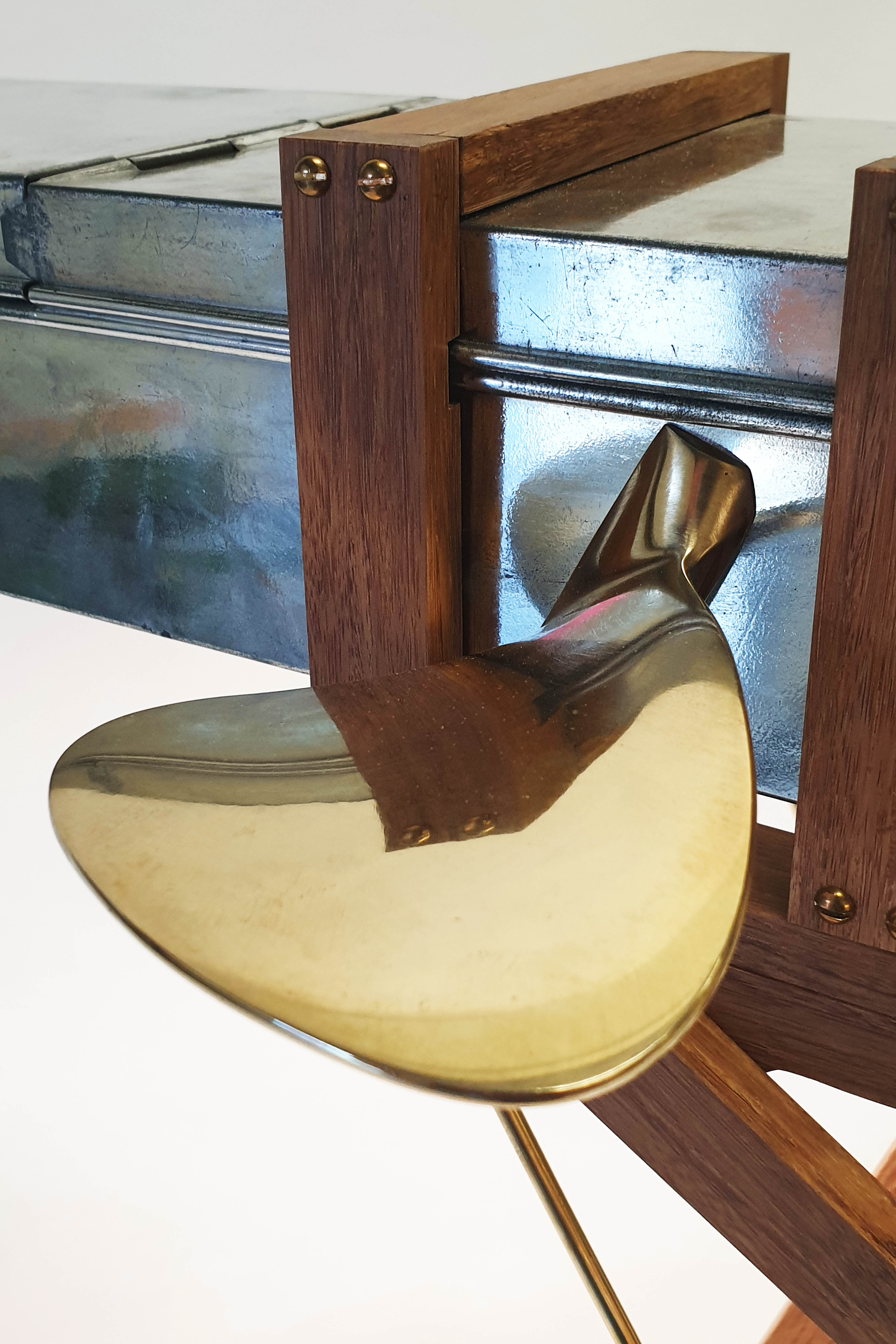 Cabinet made from a modified safe box, used by ABN Amro Bank from 1950 till 2000. The wings are made of a old brass boat propellor. The legs are made of bamboo and brass. Dimension safe box: L: 43cm W: 16cm H: 9cm. Total height, including legs: 64cm. Made in 2020